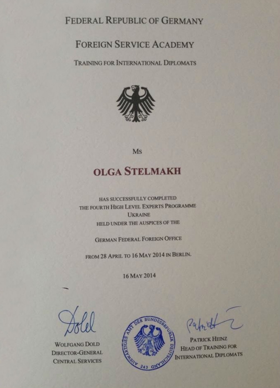 Ольга Стельмах, специальный советник ЮФ Cai & Lenard, успешно завершила «Тренинг международных дипломатов. Программа для экспертов высокого уровня» в г. Берлин. Данная программа проходила с 28 апреля по 16 мая под эгидой Министерства иностранных дел ФРГ, с привлечением сотрудников как собственно Министерства, так и подведомственной ему Дипломатической академии.